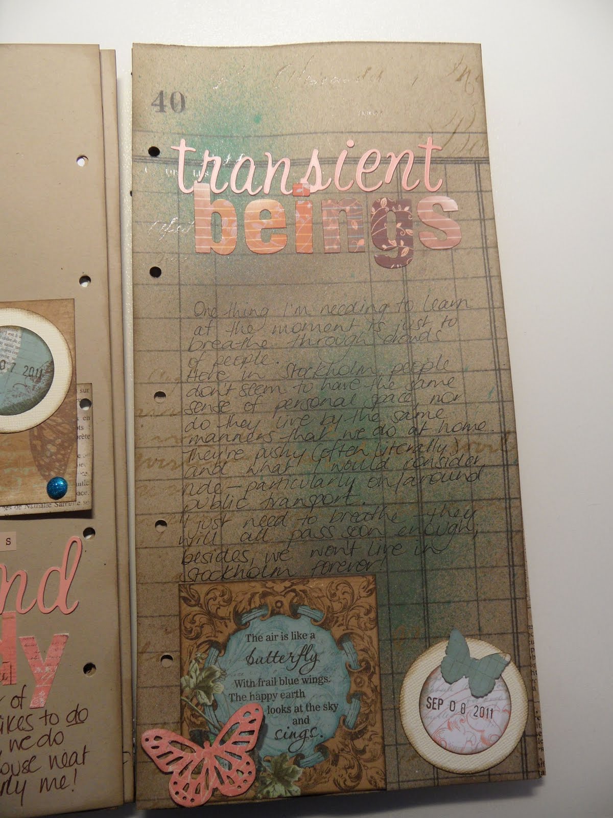 So far - I have managed to jot myself a note each day on my learning - into my iphone notes app, so that I can remember what the day taught me. Last weekend I sat and read about what everyone was up to in the forum - how they'd gone about deciding on what format of book, cards, etc to use and what their front covers looked like. And then I got into making my own... And I got my lessons in for the first few days... Yesterday, really my first chance to scrap again - I got back into it, and before dinner had all of my lessons for the week into my book... I'm really liking the class - I need to get some photos developed to go onto some of the pages (not every page has a photo though - only where they belong with the lesson) - but other than that - I'm keeping up, and liking my book and it's style and the class...
